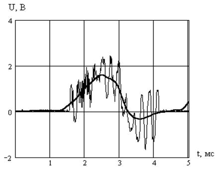 В качестве примера на рисунке 7.1 представлены экспериментальные данные ускорения (замедления) ударника с углом при вершине наконечника b=1200, полученные в результате удара по образцу из алюминиевого сплава Д16Т со скоростью v0 = 1.62 м/с, что соответствует отклонению маятника на угол q=300. Выведенные в таком виде на монитор компьютера они представляют некоторую кривую изменения ускорения (замедления) ударника во времени с модулированным по амплитуде сигналом. На рассматриваемой кривой нанесена сглаженная (усредненная) по времени характеристика этого сигнала, полученная по методу скользящего среднего.