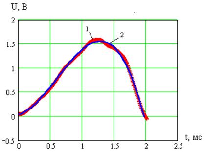 Вслед за этим, оцифрованная физическая информация усредненной сглаженной амплитуды сигнала аппроксимировалась полиномиальной регрессионной зависимостью четвертого порядка вида (7.1) и в графическом виде представлена на рисунке 7.2 (1- сглаживающая кривая, 2- полиномиальная зависимость).