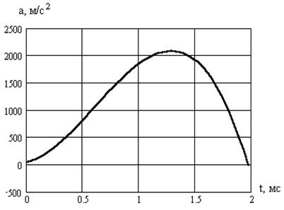 Оцифрованная физическая информация с датчика, обработанная с помощью специального программного пакета в среде MathCad, позволяющего интегрировать полученную информацию, представляется в виде графиков основных параметров процесса удара: ускорения (замедления) ударника, скорости ударника и величины его внедрения в деформируемую преграду в зависимости от времени. Первая характеристика, производимая датчиком – ускорение (замедление) ударника в процессе внедрения или контакта с деформируемой преградой представлена на рисунке 7.3.
