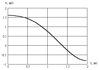 Скорость внедрения ударника представлена на рисунке 7.4. График показывает начальную скорость 1.62 м/с и скорость, при которой происходит отрыв – 0.75 м/с. График скорости плавно изменяется и пересекает ось абсцисс (в этой точке скорость обращается в нуль, а ударник достигает максимального заглубления), затем скорость меняет направление – начинается процесс отскока. Снижение скорости ударника при внедрении в преграду составляет до 70-80% от всего времени удара, тогда как выход – всего 20-30%. Следует также отметить и тот факт, что скорость выхода (отрыва) меньше на 70-80% по модулю начальной скорости удара, что обусловлено поглощением энергии удара за счет пластических свойств материала.