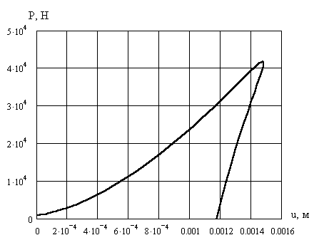 Целью всех вышеприведенных характеристик процесса удара являлась задача установления связи между силой сопротивления (напряжением) и глубиной внедрения ударника (деформацией преграды) возникающими в момент удара. Так как для конического наконечника затруднительно экспериментальное определение изменяющейся во времени площади контакта и соответственно напряжений, действующих на этой площадке, приведем зависимость силы сопротивления P от глубины внедрения u рисунок 7.6.