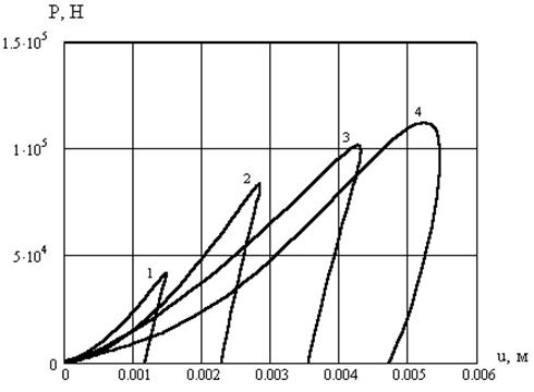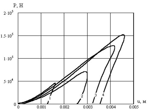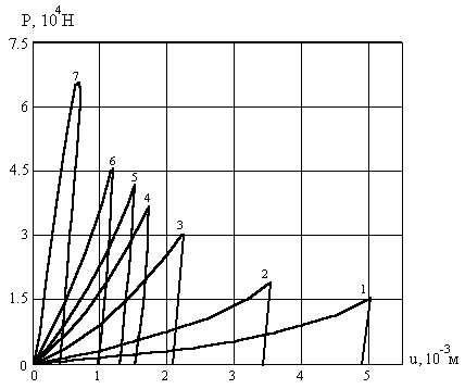 = 1600, в этом случае восходящий участок является прямым. Здесь стоит сделать замечание, что этот результат получен для определенной скорости удара и массе ударника, и будет варьироваться с их изменением. Следует отметить, что характер кривых нагружения и разгрузки сила-глубина внедрения (рисунки 7.8, 7.9, 7.10) подтверждается результатами ранних работ [5, 11]. Возрастающая кривая зависимости сила-глубина внедрения может быть описана простой эмпирической формулой, устанавливающей количественную связь между результатами испытаний и учитывающей не только начальную скорость удара, но и угол при вершине конуса. Так для зависимостей, изображенных на рисунке 7.10 получим: