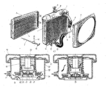 Горловину 22 герметически закрывает пробка, изолирующая систему охлаждения двигателя от окружающей среды. Пробка радиатора состоит из корпуса 19, парового 23 и воздушного 26 клапанов и запорной пружины 21. На стойке 20, при помощи которой к корпусу крепится запорная пружина, установлен паровой клапан, прижатый пружиной 18. Воздушный клапан 26 прижимается пружиной 27 к седлу 28, запрессованному в паровом клапане. Плотное соединение клапанов с седлами достигается установкой резиновых прокладок 24 и 25. При повреждении или разрушении резиновых прокладок система охлаждения становится открытой, и вода закипает при 100 °С.