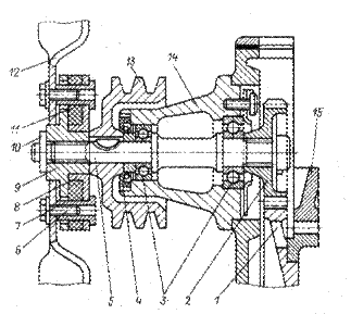 1 — шестерня распределительного вала; 2 — шестерня вентилятора; 3 — шарикоподшипники ; 4 — самоподжимной сальник; 5 — вал вентилятора; 6 — болт; 7 — распорная втулка; 8 — ступица муфты; 9 — ступица крыльчатки вентилятора; 10 — гайка; 11 — резиновая упругая муфта; 12 — крыльчатка вентилятора; 13 — шкив привода генератора и компрессора; 14 — корпус вентилятора; 15 — шестерня привода топливного насоса высокого давления