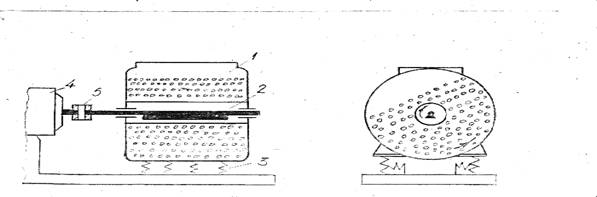 Рис 2. Схема вибрационной мельницы:1-корпус-барабан,2-вибратор вращения,3-спиральные пружины,4-электродвигатель,5-упругая соединительная муфта.
