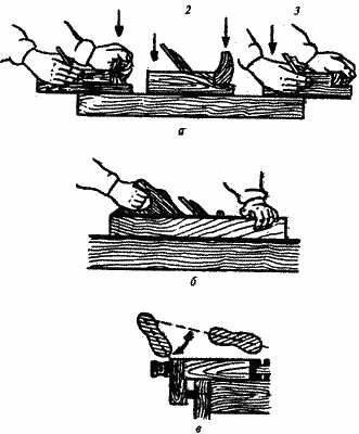 Приемы строгания: а - рубанком; б - фуганком; в - положение ног при строгании; 1, 2, 3 - нажим на рубанок соответственно в начале, середине и конце строгания