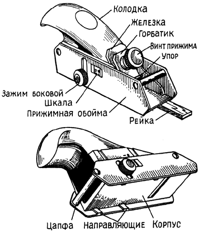 Рубанок состоит из металлической или деревянной колодки и резца, так называемой железки. В металлических рубанках резец закрепляется регулируемым винтом, в деревянных - клином.