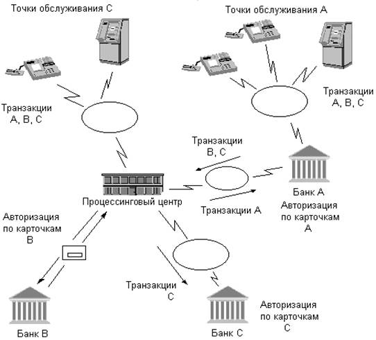 Кроме того, из процессингового центра в банк А поступают транзакции по его карточкам. В центре же эти транзакции (как и транзакции по карточкам В и С) попадают из точек обслуживания, подключенных непосредственно к процессинговому центру.
