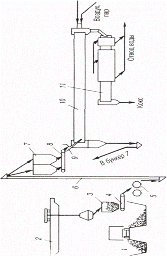 Исходный сырой кокс поступает на склад и по транспортной системе 2-4 подается на первичное дробление к валковой зубчатой дробилке 5. Через систему питания 6-8 кокс подается в прокалочный агрегат 9-10 и далее по системе транспорта прокаленный кокс поступает в бункер запаса 16.