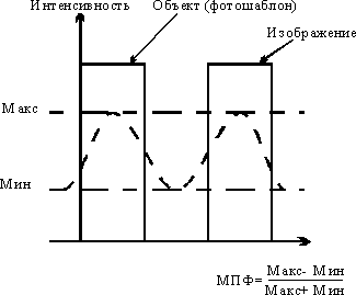 контроля ширины линии и чувствительности к условиям экспозиции. Модуляция в 60% соответствует Iмакс=80% и Iмин=20% интенсивности света, пропущенного дифракционными элементами объектива (рис.4). При минимальной МПФ »0.60 допускается 20%-ое недоэкспонирование резиста. МПФ проекционной системы, имеющий дифракционные ограничения и некогерентный источник, идентично преобразованию Фурье круглого входного зрачка объектива: