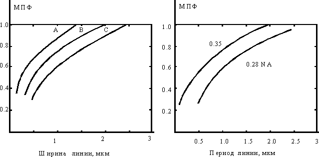 МПФ оптических приборов резко спадает на пространственной частоте, которая ограничивает диапазон пространственных частот изображаемого предмета. При увеличении NA и уменьшении l улучшается качество передачи изображения (рис. 6). Расфокусировка может рассматриваться как аберрация. Таким образом, использование тонких пленок в многослойном резисте или резисте с поверхностным переносом изображения позволяет увеличить разрешение, особенно в случае близко расположенных линий или элементов.