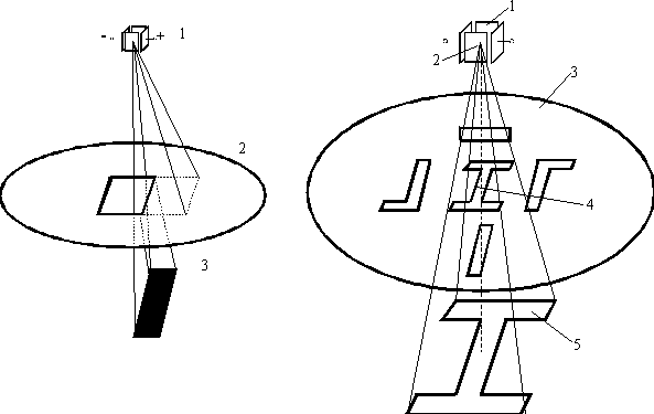 Рис. 19. Экспонирующая ЭЛ-система с прямоугольным лучем переменной формы. 1 - пластины, управляющие формой луча; 2 - вторая квадратная диафрагма; 3 - полученное пятно. Рис. 20. Символьная проекционная ЭЛ-печать. 1 - отклоняющие пластины; 2 - фокус; 3 - символьные апертурные отверстия; 4 - символьная диафрагма; 5 - полученное изображение (сечение луча).