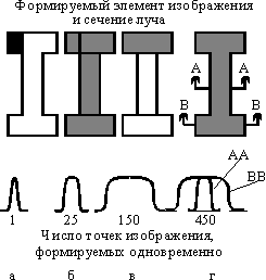 Рис. 21. Число точек изображения, формируемых круглым гауссовым лучем (а), лучем фиксированной квад-ратной формы (б), лучем переменной формы (в) и проецированием фигур (г).