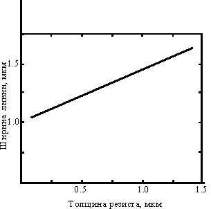Рис. 22. Влияние толщины резиста на величину взаимного эффекта близости в периодической структуре из линий и промежутков шириной 1.0 мкм (кремниевая подложка, позитивный резист, энергия пучка 25 кэВ).