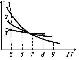 При выборе способа обеспечения заданного размера следует особо учитывать производимые затраты. На рис. 1 приведен график затрат С в зависимости от квалитета точности, достигаемого различными методами обработки. Кривая 1 показывает существенное увеличение затрат при достижении высокой точности, что связано с необходимостью применения прецизионных станков и квалифицированной рабочей силы. Этот эффект снижается с применением чистового шлифования (кривая 2) и далее - тонкого шлифования (кривая 3).
