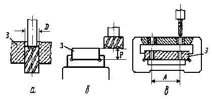 В ходе достижения заданного размера всегда используется замкнутая технологическая система, поэтому любой размер концентрирует погрешности, создаваемые всеми элементами системы. Тем не менее, во многих случаях из всех погрешностей можно выделить доминирующие, т.е. те, которые влияют на размер в наибольшей степени. Можно считать, что, например, при развертывании отверстия в заготовке 3 (рис. 2, а) диаметр D отверстия будет в основном определяться размерами инструмента. Поэтому величину D можно условно назвать "размер - инструмент". Аналогично размер Р (рис. 2, 6) будет в значительной степени определяться степенью настройки фрезерного станка относительно заготовки. Поэтому величину Р можно условно назвать ''размер - станок". При сверлении отверстий в заготовке, помешенной в приспособление (сверлильный кондуктор), расстояние А на детали в наибольшей степени будет зависеть, от точности изготовления кондуктора (рис. 2, в). Поэтому величину А можно условно назвать "размер - приспособление". Такая классификация размеров может быть использована при общем анализе формирования точности деталей.