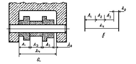 Возможность осуществления сборки с полной взаимозаменяемостью проверяется с помощью теории размерных цепей. Размерная цепь может быть рассмотрена непосредственно на рабочем чертеже (рис.3, а) или в виде схемы (рис.3, б). Любой размер (звено цепи) может быть представлен как замыкающий. Например, значения А1, А2, .,Am могут являться или непосредственно размерами, или отклонениями (допусками). Замыкающее звено (в данном случае зазор) обозначено А0. Размерная цепь должна быть непременно замкнута. Основное уравнение теории размерных цепей имеет вид