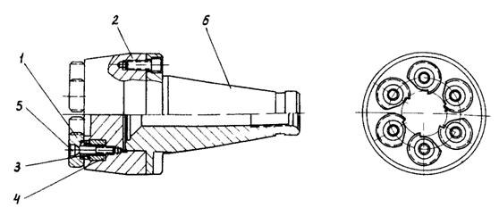 На рис. 13 показана разработанная в процессе исследований сборная фреза с круглыми гребенками, подобными гребенкам резьбонарезных головок. Фреза состоит из шести круглых гребенок 1, соединенных с корпусом 2 звездочкой 3, втулкой 4 и винтом 5. фреза крепится в шпинделе при помощи конического хвостовика 6, затягиваемого штангой.