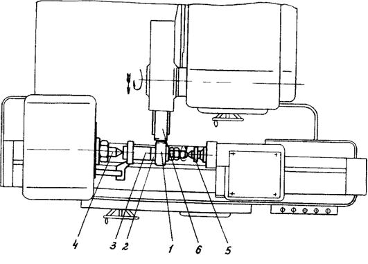 Гребенка 1 закрепляется на оправке 2, имеющей с одного торца эбонитовую втулку 3. Оправка закрепляется в центрах 4 и 5. Центр 5 изолирован от массы станка. Оправка приводится во вращение от шпиндельной бабки через поводок. Гребенка вращается со скоростью 75 об/мин и является положительно заряженным электродом.