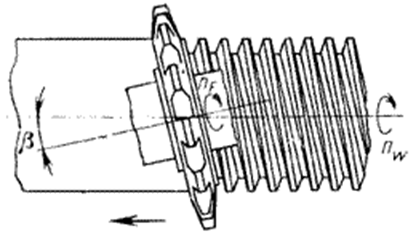 При фрезеровании длинных резьб длина резьбы на заготовке не зависит от ширины фрезы, что позволяет изготавливать очень длинные резьбы. В качестве инструмента применяют дисковые профильные фрезы (рис.23). Соответственно шагу резьбы ось фрезы поворачивается к детали (рис.24). При нарезании внутренней резьбы длина резьбы ограничена наклоном фрезы. Дополнительные ограничения накладывает угол при вершине профиля. Если угол менее 10 градусов, то появляются значительные искажения профиля. Таким образом, данным методом нельзя нарезать прямоугольную резьбу. Можно использовать попутное и встречное фрезерование. При попутном фрезеровании стойкость инструмента выше, в то время как при встречном выше точность и качество поверхности. Резьбовые профили могут быть изготовлены также, аналогично зубчатым колесам, фрезерованием методом обката. Экономично применение этого метода при обработке многозаходных резьб крупного профиля, например червяков.