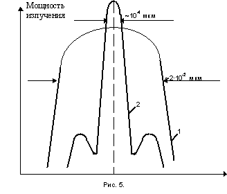 Лазерный диод не сразу начинает излучать при приложении к нему напряжения от внешнего источника. При малом токе имеет место спонтанное излучение (рис. 5) с шириной спектра излучения в несколько сот микрометра. По мере нарастания тока накачки в области p—n-перехода создается высокая степень инверсии населенности и излучается больше света. Отдельные фотоны многократно проходят строго в плоскости p—n-перехода и перпендикулярно к торцам диода усиливаются. С возрастанием тока накачки испускаемое диодом излучение существенно сужается одновременно по ширине спектра и по пространственной расходимости. Когда возникает индуцированное излучение, интенсивность излучения увеличивается за счет образования большого количества электронно-дырочных пар в единицу времени. Спонтанное излучение подавляется вследствие того, что образовавшиеся первоначально фотоны повторяют себя при прохождении через активную область. Излучение лазерного диода, полученное при плотностях тока выше порогового, являются когерентными. При этом форма кривой спектрального распределения резко изменяется от широкой кривой распределения спонтанной эмиссии 1 к кривой с несколькими узкими модами 2 (рис. 5).