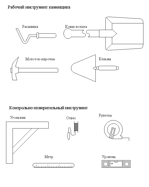 При выполнении кирпичной кладки и монтажных работ применяются: кельма, ковш-лопата Мальцева, правило, уровень, отвес, молоток-кирочка, расшивка, угольник, шнур-причалка.