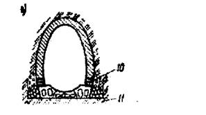 I - смотровые колодцы; 2 - водосборный колодец: 3 - дренажные трубы; 4- насосная станция; 5 - насыпной грунт; 6 - глиняный экран; 7 - песок; 8 - гравий; 9 - щебень; 10 - труба с отверстиями для входа воды;
