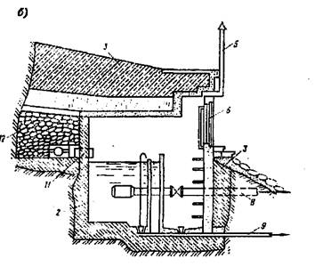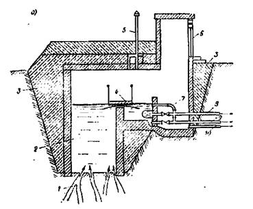 Каптажные водосборные сооружения устраивают двух типов: для каптажа восходящих родников водоприемные сооружения представляют собой шахты или резервуары, размещаемые над местом наиболее интенсивного выхода подземных вод (рис. 6а); для каптажа нисходящих родников сооружают приемные камеры, располагаемые в месте интенсивного выхода родниковой воды (рис. 6б). В стенке камеры, обращенной к фронту поступления подземных вод, предусматривают водоприемные окна.