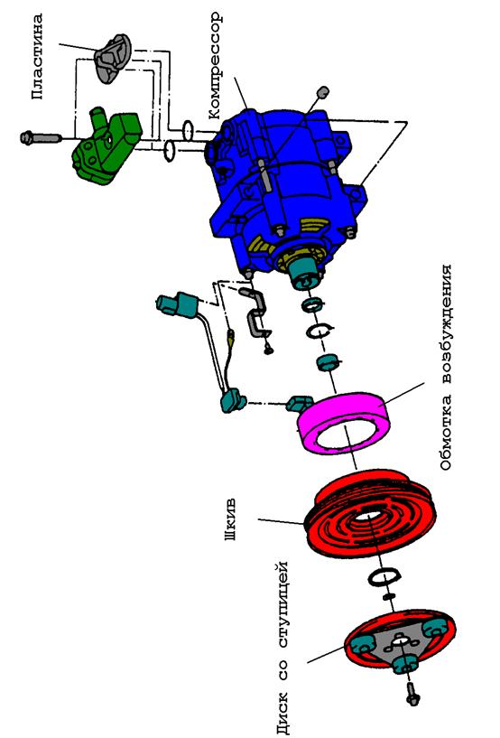 Компрессор вращается от передачи муфты компрессора вращающегося момента шкивом коленчатого вала через приводной ремень. Если на магнитную муфту не подается напряжение, то вращается только сам шкиф муфты компрессора и не вращается вал компрессора. При подаче напряжения на магнитную муфту диск и втулка муфты перемещаются назад и соединяются со шкивом. Шкив и диск под действием сил становятся едиными и приводят во вращение вал компрессора.
