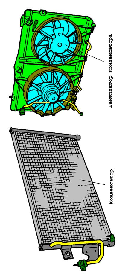 Кондансатор устанавливается перед радиатором и выполняет функцию превращения газообразного высокотемпературного хладагента, идущего от компрессора в жидкое состояние выделением тепла в атмосферу. Количество выделяемого хладогентом тепла в конденсаторе определяется количеством поглощенного испарителем тепла из вне и работой компрессора, необходимой для сжатия газа. Для конденсатора результат теплоотдачи прямо влияет на эффект охлаждения холодильной устоновки, поэтому, обычно он устанавливается на самой передней части автомобиля и принудительно охлаждается воздухом вентилятора системы охлаждения двигателя и потоком воздуха, возникающим при движении автомобиля.