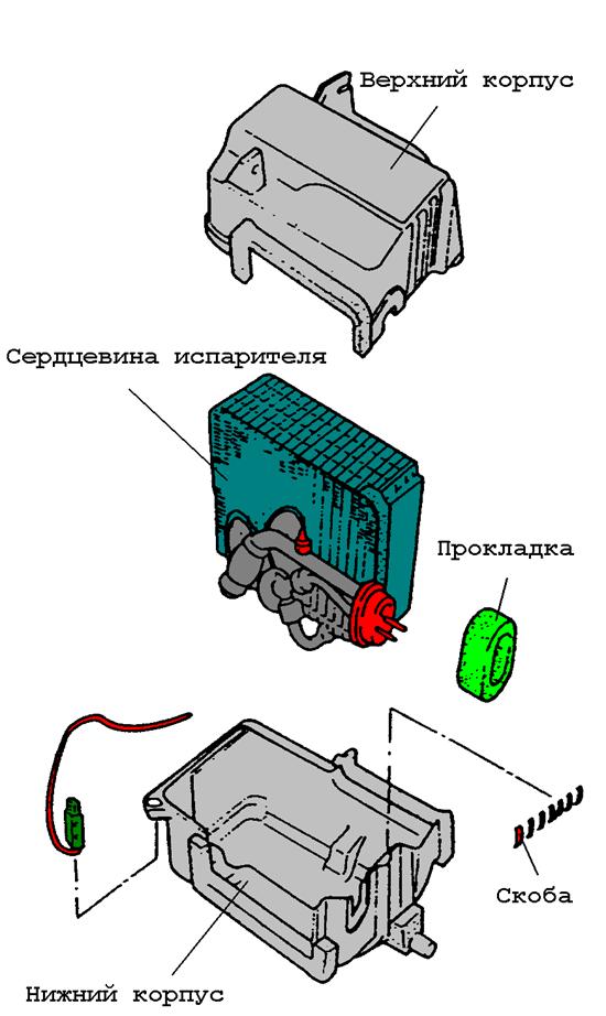 Хладагент, прошедший через расширительныйклапан, став легкоиспаряющимся с низким давлением, при прохождении в туманообразном состоянии через патрубок испарителя, под действием потока воздуха от вентилятора, испаряясь превращается в газ. При этом рёбра патрубка становятся холодными от теплоты парообразования, и воздух внутри автомобиля становится прохладным. Кроме того, влага, содержащаяся в воздухе, от охлаждения превращается в воду и вместе с пылью по спусковому трубопроводу выбрасывается из автомобиля.