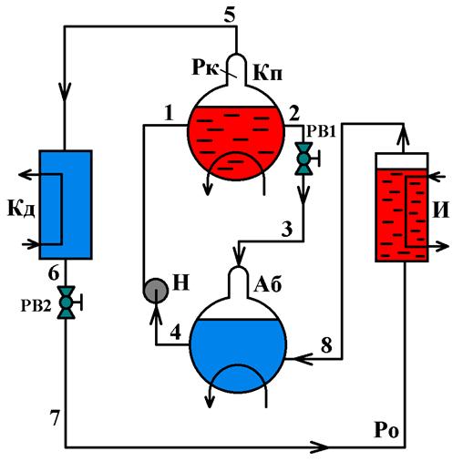 Водоаммиачный насос Н подаёт в кипятильник крепкий раствор большой концентрации er при давлении конденсации Рк и температуре t1. Значительная часть образующихся в кипятильнике паров аммиака при температуре t5 поступает в конденсатор Кд, в котором вместе с парами воды сжижается. Слабый раствор концентрации eа при температуре t2 дросселируется в регулирующем вентиле РВ1 до давления кипения Ро и температуры t3, затем направляется в абсорбер Аб, где абсорбируются пары, поступающие из испарителя И. Тепло абсорбции отводится охлаждающей водой.