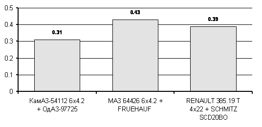 Вывод: Наилучшие показатели, как видно из табл. 4 и 5, следует отнести к автопоезду МАЗ 64226 6´4.2 + FRUEHAUF. При использовании данного АТС в перевозках наблюдается уменьшение общего пробега за период по сравнению с автопоездами на базе тягачей RENAULT и КамАЗ на 17 %, и 55 % соответственно. Возросла производительность за ездку в тоннах и тонно- километрах по сравнению с автопоездами на базе тягачей RENAULT, КамАЗ на 6 % и 54% соответственно. В результате чего уменьшилось число автомобилей, работающих на маршруте, их списочное количество 7 ед. против 9 и 16 автопоездов на базе тягачей RENAULT и КамАЗ соответственно. Еще один важный показатель - общий расход топлива за период - у автопоезда МАЗ–64226 6´4.2 + FRUEHAUFниже на 6 % и 47 % чем у автопоездов на базе тягачей RENAULT и КамАЗ соответственно.