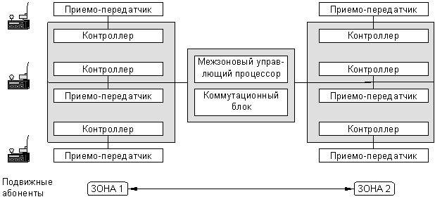 Мобильная радиосвязь можно организовать как в гражданском диапазоне, на частоте 27 МГц, так и профессиональном, на частотах 160 МГц или 400 МГц (чем выше частота, тем лучше качество связи). Профессиональный диапазон открыт только для юридических лиц и для работы на нем необходимо разрешение Главгоссвязьнадзора РФ. Для удобства абонента можно спроектировать 2-х и более зоновую систему обслуживания, т. е. появляется возможность так организовать связь, чтобы прием сигнала осуществлялся в различных районах, а вся информация передавалась через единый коммутатор. Схематично это выглядит следующим образом (рис. 9).
