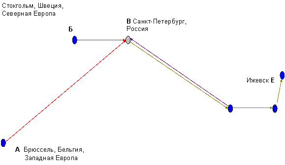 Сезонность перевозок значительно влияет на работу автомобильного транспорта, поэтому для правильного выбора и использования подвижного состава, необходимо учитывать сезонные колебания грузооборота. В каждом конкретном случае перевозок автомобильный транспорт обслуживает отдельные корреспонденции клиентуры между двумя определенными пунктами. Таким образом, между каждой парой корреспондирующих между собой пунктов возникают грузовые потоки. Эти потоки в прямом и обратном направлениях обычно неравны [1]. В связи с этим представляет интерес диаграмма грузопотоков с некоторыми узловыми пунктами, которая изображена на рис. 3.
