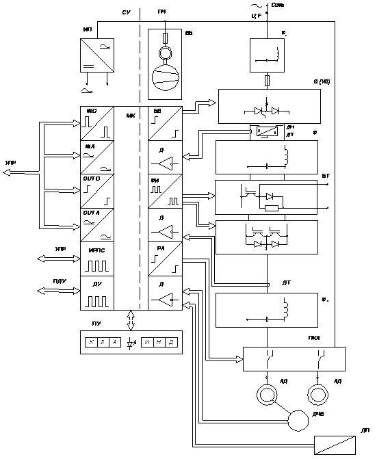 ФИ – усилитель – формирователь; БТ – блок тормозной; Ф1,Ф2,Ф3 – фильтр; ПКА – блок выходных программ; ВБ – блок вентиляторов; ИП – многоканальный источник питания; Д – блок датчиков; ДН, ДТ – блок защит; МК – программный микроконтроллер; ДЧВ – датчик частоты вращения; РА – блок линейной автоматики; ИРПС – каналы интерфейсной связи.