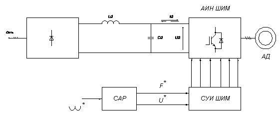 В – выпрямитель; Ld – дроссель фильтра Ф (см. рисунок 3); Id – активная составляющая тока фильтра; Cd – ёмкость фильтра; Ud – напряжение фильтра; ω* - задание на входе инвертора; F* , U*- частота и значение выходного напряжения соответственно, согласно V/f – характеристике; САР – система автоматического регулирования; СУИ ШИМ – система управления широтно-импульсной модуляцией; АИН ШИМ – автономный инвертор напряжения с широтно-импульсной модуляцией.
