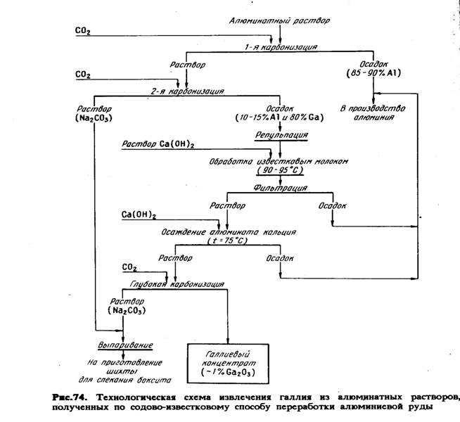 При выделении гидроксида алюминия из растворов методом карбонизации (пропускание через раствор СО2) или "декомпозиции" гидроксид галлия осаждается позже гидроксида алюминия, что объясняется различием в значениях рН начала осаждения А1(ОН)з и Gа(ОН)з из щелочных растворов, которые равны 10,6 и 9,7 соответственно. Вследствие этого циркулирующие маточные растворы процесса декомпозиции и последние фракции осадков, выпадающих при карбонизации, обогащены галлием. Так, при переработке по способу Байера боксита, содержащего 0,0025 % Ga, в оборотных маточных растворах после декомпозиции отношение Ga2O3, к А2О3 в растворе достигает 0,15 - 0,3 %, что примерно в 30 -50 раз выше, чем в исходном сырье. Концентрация галлия в оборотном растворе колеблется от 0,07 до 0,15 г/л.