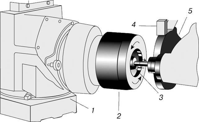 УНИВЕРСАЛЬНЫЙ ШЛИФОВАЛЬНЫЙ СТАНОК с наружным и внутренним шлифовальными кругами. На схеме показано шлифование внутренней фаски стальной заготовки штамповой матрицы. Делительная бабка позволяет выполнять шлифование под любым углом. Обрабатываемая деталь и шлифовальный круг вращаются в противоположных направлениях. 1 – делительная бабка; 2 – деталь; 3 – внутренний шлифовальный круг; 4 – отсос пыли; 5 – наружный шлифовальный круг.