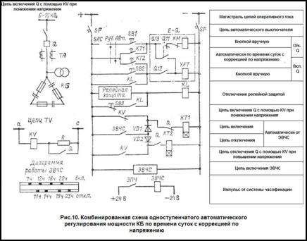 Иногда применяется комбинированное регулирование - по времени суток с коррекцией по напряжению. Такие схемы регулирования могут быть применены для одно- и многоступенчатого регулирования. Особое внимание следует обращать на исключение возможности повторного включения КБ в заряженном состоянии. Для этой цели используется реле времени с выдержкой 2-3 мин после отключения и нового включения КБ. Это время необходимо для разрядки конденсаторов.