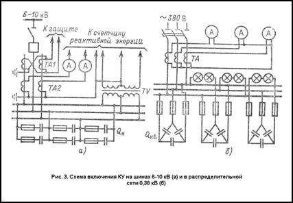 Удельная стоимость конденсаторов высокого напряжения меньше удельной стоимости конденсаторов низкого напряжения, но конденсаторы низкого напряжения проще и надёжнее в эксплуатации. Комплектные конденсаторные установки имеют встроенное разрядное сопротивление Rдля снятия остаточного напряжения при отключении ККУ от сети. Иногда в качестве разрядного сопротивления применяют два однофазных