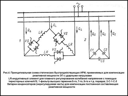 Разновидностью СД являются синхронные компенсаторы (СК), которые представляют собой СД облегчённой конструкции без нагрузки на валу. В настоящее время выпускается СК мощностью выше 5000 квар; они имеют ограниченное применение в сетях промышленных предприятий и лишь в ряде случаев используются для улучшения показателей качества напряжения у мощных ЭП с резкопеременной ударной нагрузкой (дуговые печи, прокатные станы и т.п.). В сетях с резкопеременной ударной нагрузкой на напряжении 6-10 кВ рекомендуется применение не конденсаторных батарей, а специальных быстродействующих источников реактивной мощности (ИРМ), Которые должны устанавливаться вблизи таких ЭП. Схема ИРМ приведена на (рис. 4). В ней в качестве регулируемой индуктивности используются индуктивности LR и нерегулируемые ёмкости С1-С3.