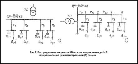 Рассмотрим размещение КБ в сетях напряжением до 1 кВ при отсутствии в этих сетях СД. Распределение мощностей КБ в таких сетях зависит от структуры сети - радиальная (рис. 7, а) или магистральная (рис. 7, б). В радиальной сети от шин 0,4-0,69 кВ ТП отходят п радиальных линий, питающих п силовых шкафов с реактивными расчётными нагрузками