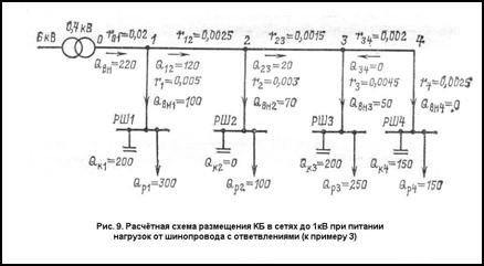 Пример 3 Схема питания нагрузок 0,4 кВ, значения расчётных реактивных мощностей, сопротивления ответвлений от шинопровода и сопротивления участков шинопровода показана на (рис. 9). Суммарная расчётная мощность КБ на стороне 0,4 кВ