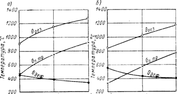 Формула показывает закономерность изменения температуры резания в зависимости от разных факторов. На основе ее построены графики изменения составляющих температуры резания в зависимости от скорости резания для минералокерамического (рис.3, а) и для твердосплавного резца (рис. 3, б). Как видим, с увеличением скорости резания уменьшается температура деформации, но возрастает температура трения. В результате температура резания повышается, но в значительно меньшей степени, чем сама скорость.