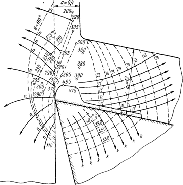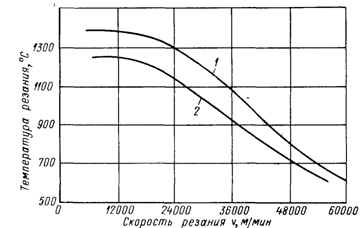 Как уже отмечено, температура резания растет менее интенсивно, чем скорость. По мере нагрева резца разность температур стружки и резца падает, а поэтому интенсивность передачи теплоты от стружки резцу уменьшается. Следовательно, с увеличением скорости резания v температура резца значительно поднимается, но в меньшей степени, чем скорость. Современные экспериментальные исследования процесса резания высокопрочных сталей с ультравысокими скоростями (до 72 000 м/мин), когда процесс происходил адиабатически (без теплообмена),
