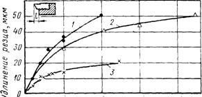 1 — l = 1,5 мм, 2 — l = 3 мм, 3 — стружка отводилась от резца или задние грани державки изолировались
