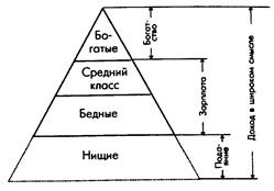 Между двумя полюсами классовой стратификации американского общества — очень богатыми (состояние — 2 млн. долл. и более) и очень бедными (доход менее 6,5 тыс. долл. в год), составляющих от общей численности населения приблизительно одинаковую долю, а именно 5%, расположена та часть населения, которую принято называть средним классом. В индустриально развитых странах он составляет большинство населения — от 60 до 80%.
