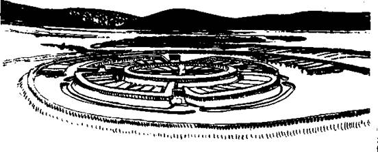 Как уже отмечалось, главный вход имел в плане форму сектора, которую образовывали изломы обводных стен. Вершина сектора как бы «упиралась» в стену цитадели. Именно на этом центральном участке правомерно было искать основные ворота - въезд в поселок. Однако и здесь были обнаружены глухие стены и глубокий ров. Вход в поселок оказался в боковой северо-западной стене. Он имел ширину около 6 м и выходил сразу на круговую улицу. По нашим сегодняшним наблюдениям, стена цитадели была сплошной и нигде не прерывалась, за исключением одного участка к востоку от сектора главного входа. Таким образом, чтобы попасть на территорию внутреннего круга поселения, нужно было пройти или проехать по всей длине кольцевой улицы. Только в ее конце через особые ворота можно было проникнуть к центральной площади и окружающим ее жилищам. И другого пути не было! Такой маршрут мог иметь не только оборонительное, но и ритуальное значение.