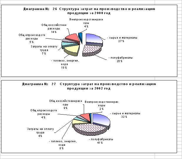 Затраты на производство и реализацию продукции выросли пропорционально выпуску товарной продукции почти в 5 раз. При этом в структуре затрат наибольший удельный вес занимают материальные затраты (см. Диаграммы №26, 27). В 2000 году материальные затраты составляли 70% затрат на производство и реализацию продукции, в 2002 году. За счет увеличения доли покупных полуфабрикатов ( с 25% до 41% в затратах) до 81%. В 2002 году структура материальных затрат такова: